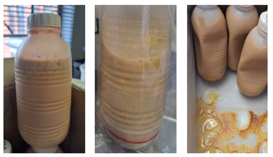 A major concern was found in one strawberry flavoured milk sample processed at 121 ºC with EDTA. This sample exhibited near-complete coagulation, with only minimal free liquid remaining. A substantial coagulated mass was expelled upon opening, and the product showed a low pH of 4.83, compared to the > 6 pH recorded for all other samples. Such a drop in pH is strongly associated with severe heat-induced protein destabilisation.