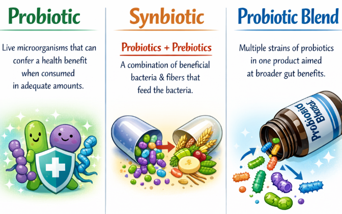 - Synbiotic: A combination of probiotics and prebiotics (e.g., fibers that feed the bacteria).